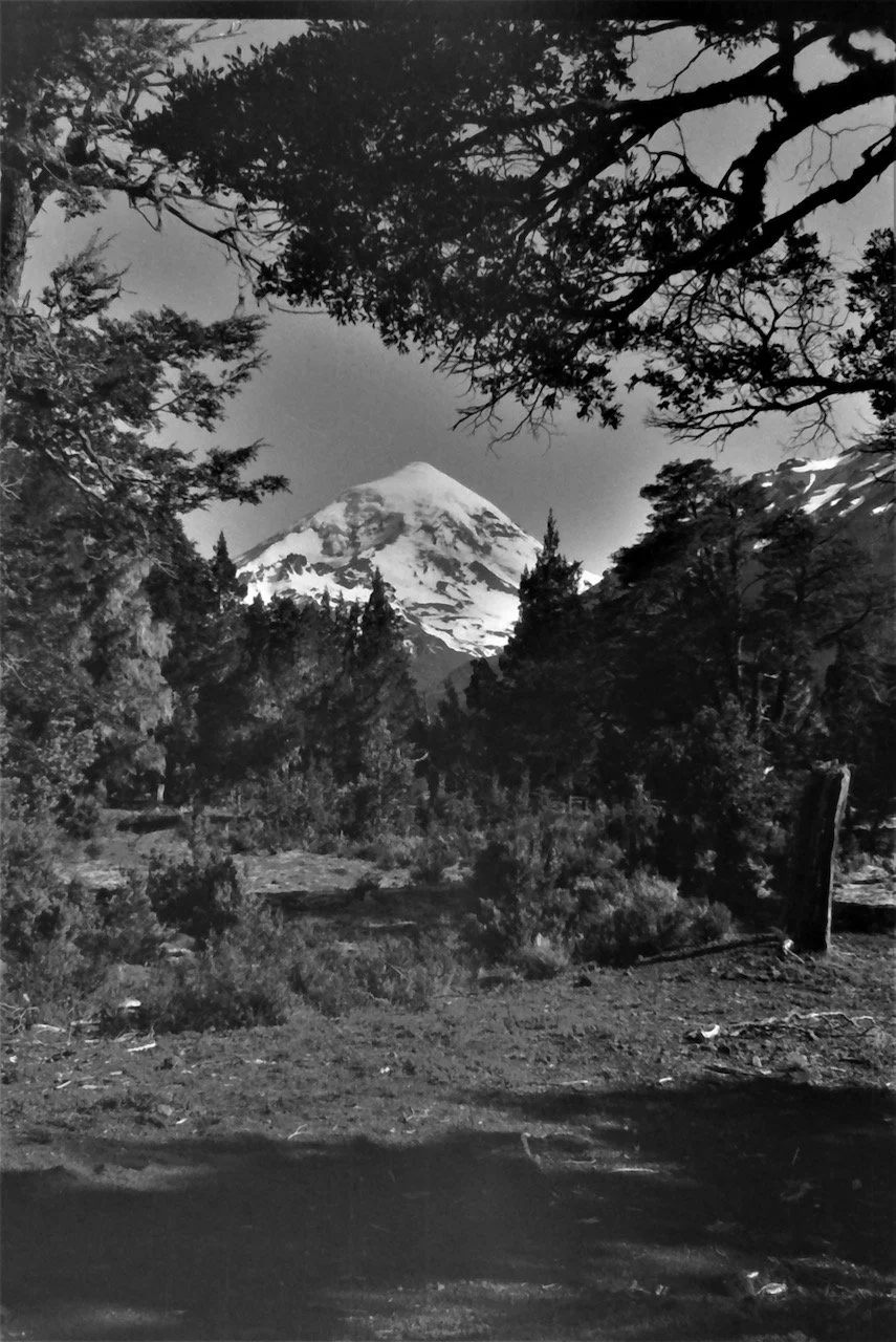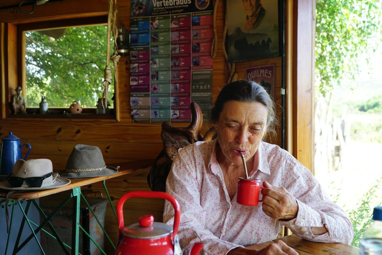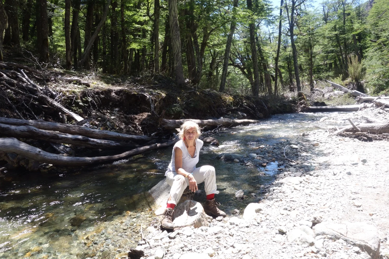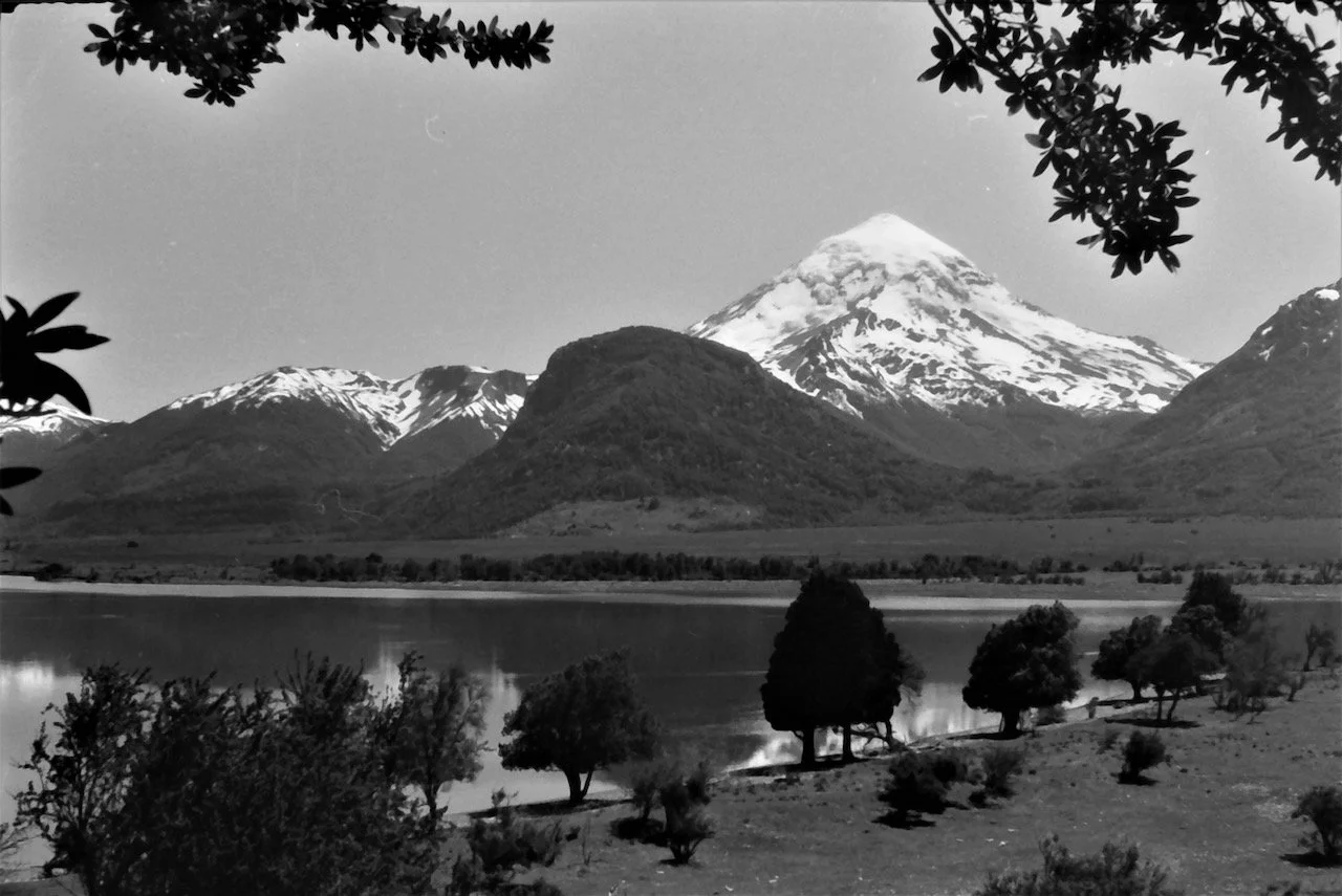 Carlota está sentada en una piedra, lleva un jersey de lana de punto casero con motivos noruegos, pantalones oscuros ajustados y botas de montaña. Un inmaculado cuello blanco sobresale del escote de su jersey. A Carlota le gusta llevar blusas, para todas las ocasiones y en todas las estaciones. Sostiene su cámara con una mano y apoya la cabeza con la otra, con el codo apoyado en la rodilla de su pierna flexionada. Mira a lo lejos, casi soñando, pero con la mirada clara. Al fondo se ve un valle apacible, aún cubierto de nieve, con colinas oscuras detrás y el Lago Lácar, tras cuyas orillas se alza la cordillera de los Andes. Está al borde del camino al Cerro Chapelco, hoy estación de esquí de la región. Siempre amó estas montañas, el lago y los bosques; se sentía como en casa. Murió aquí en 2009, a los 92 años.