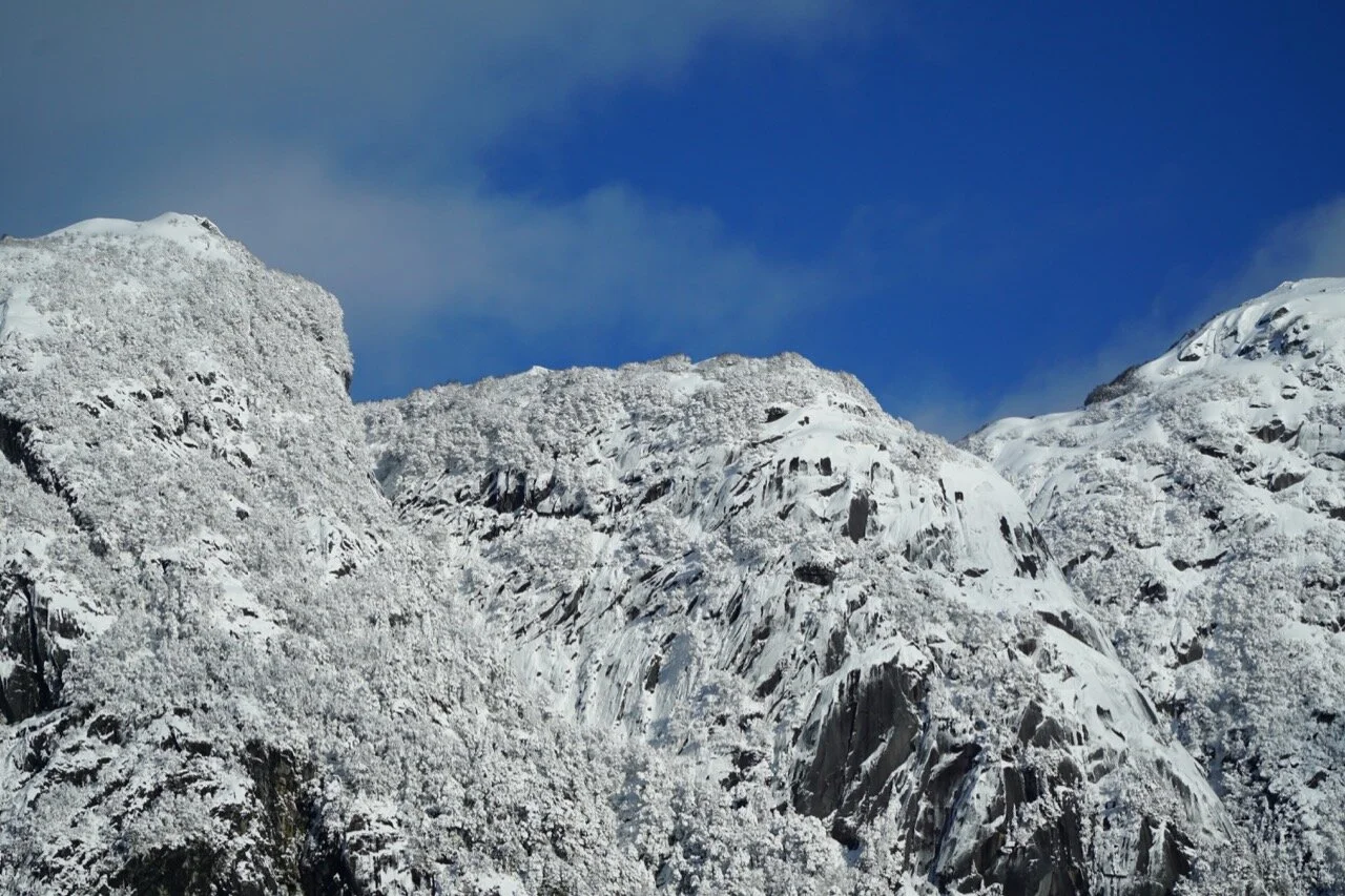 Am nächsten Morgen lag noch mehr Schnee, aber zu unserer großen Freude schien die Sonne auf die Berge, den See und den kalten Dschungel.